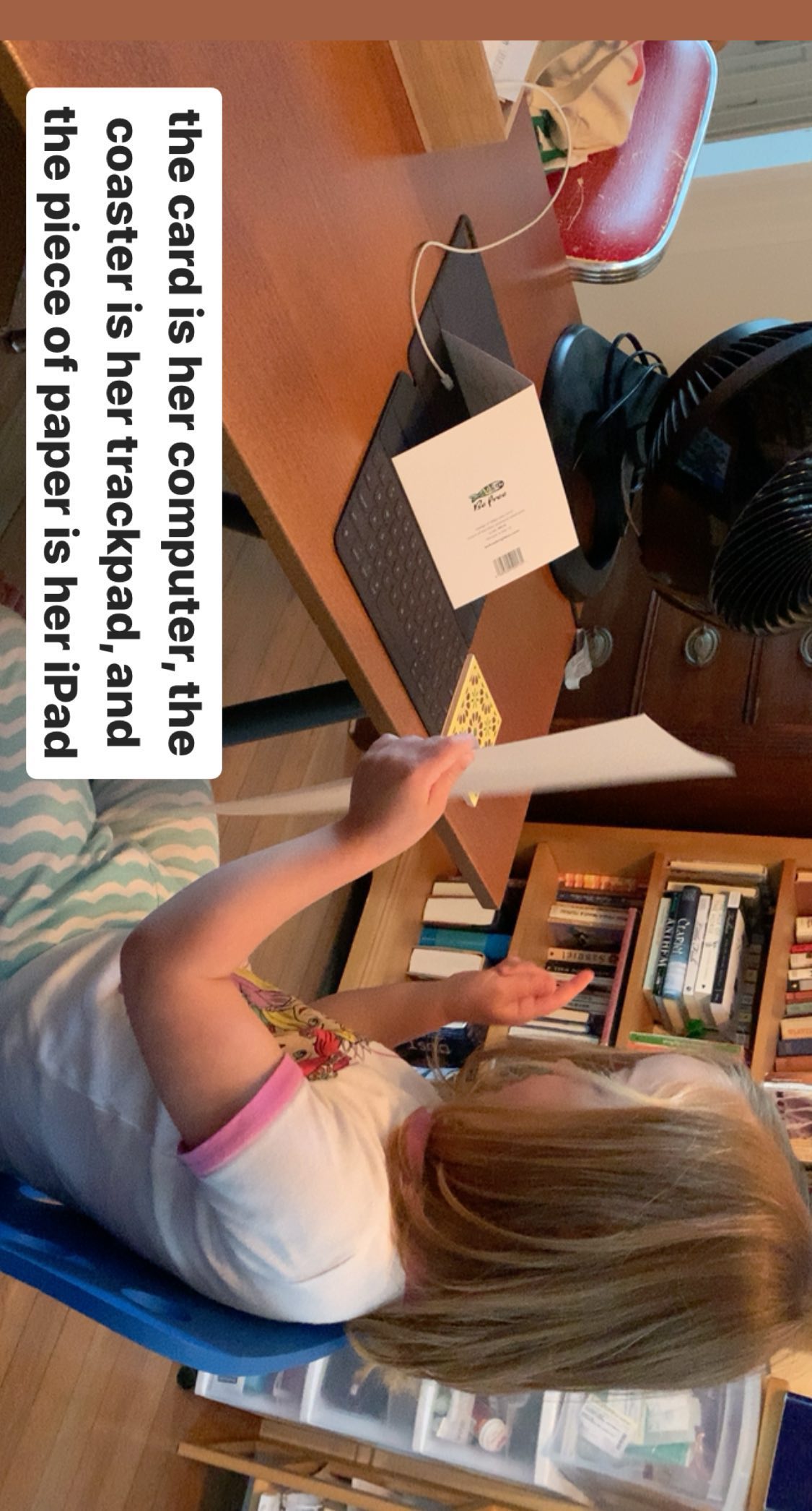 the card is her computer, the coaster is her trackpad, and the piece of paper is her iPad