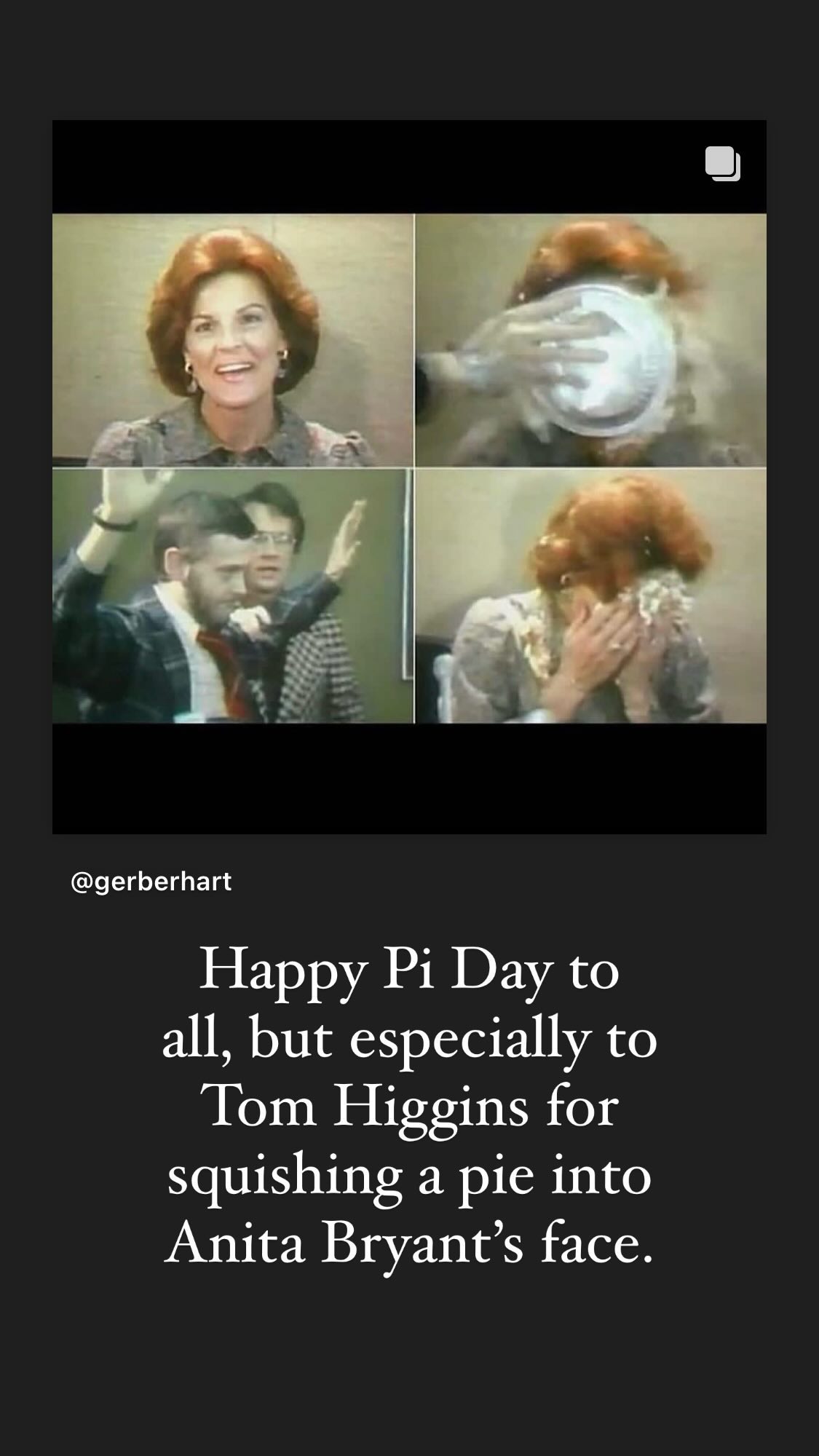 Happy Pi Day to all, but especially to Tom Higgins for squishing a pie into Anita Bryant’s face.