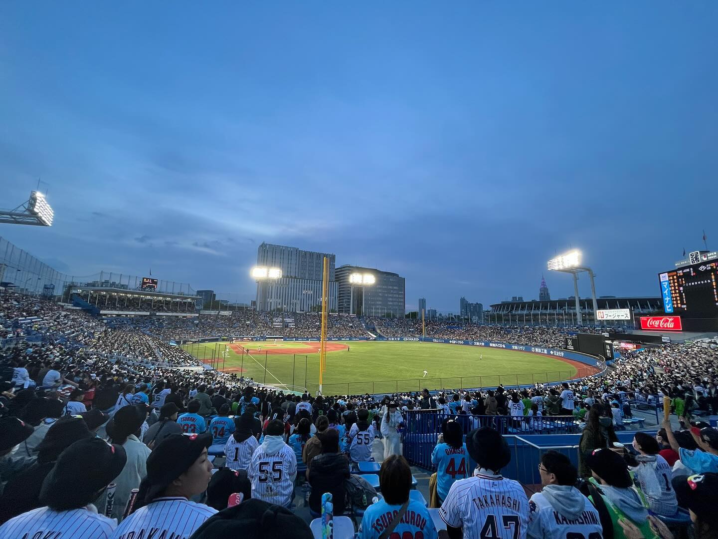 This is Meiji Jingu Stadium, the second-oldest in NPB. Babe Ruth played here in 1934. This is Giants @ Swallows, the Japanese equivalent of a Yankees @ Mets game. I’m here with my oldest friend, @rafuzo, and life is indeed good.