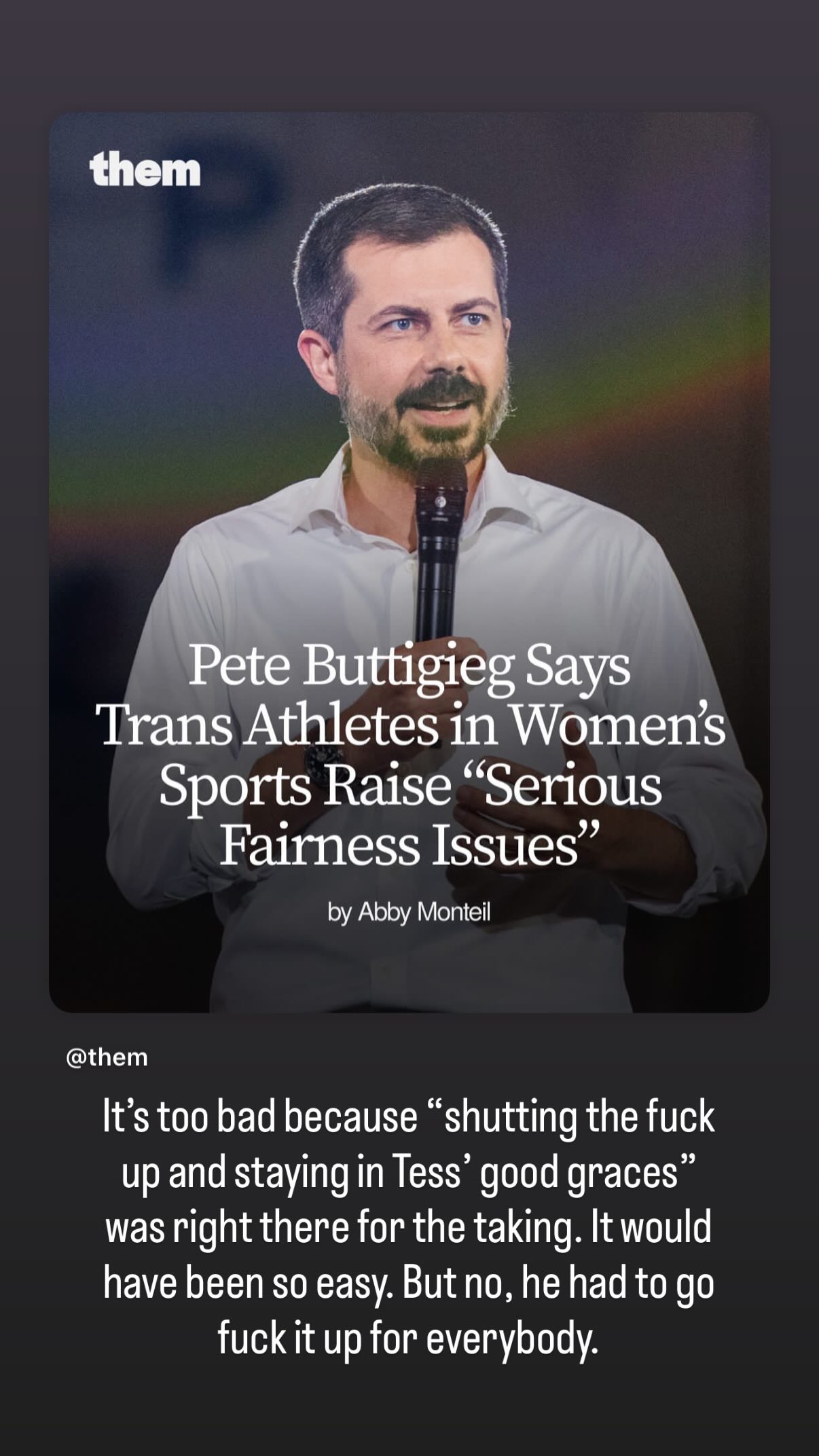 It’s too bad because “shutting the fuck up and staying in Tess’ good graces” was right there for the taking. It would have been so easy. But no, he had to go fuck it up for everybody.